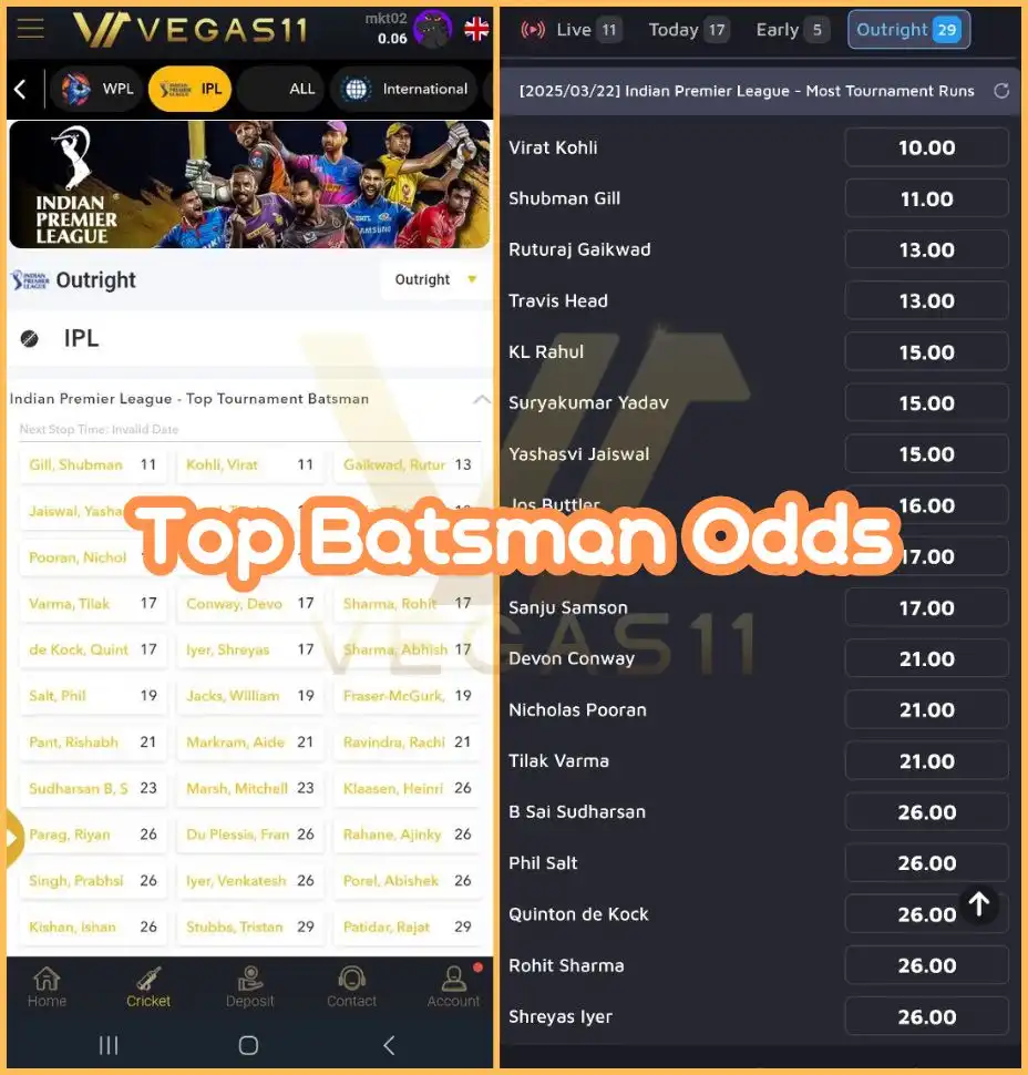 To help you find the best odds, we’ve compared the latest IPL betting markets across India’s top three platforms—Vegas11, Bet365, and Stake. Explore different odds options and make the most of your bets!