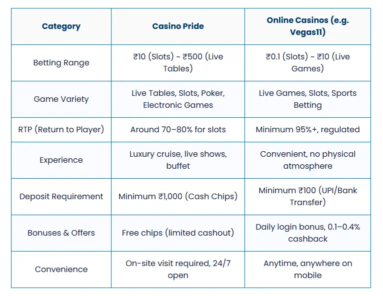 | Category | Casino Pride | Online Casinos (e.g. Vegas11) |