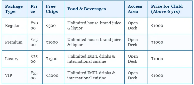 | Luxury | ₹3500 | ₹1500 | Unlimited IMFL drinks & international cuisine | Open Deck | ₹1000 |