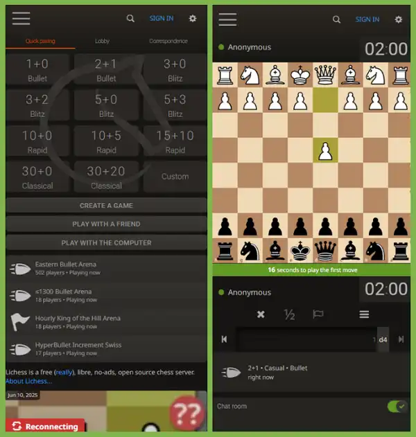 Online chess websites and apps where you can play without spending money to recharge – recommend Lichess because it doesn’t interrupt your games with annoying video ads!